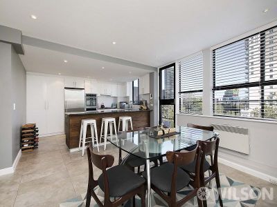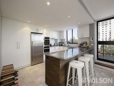Capturing panoramic Albert Park Lake and Bay views from this 6th floor apartment. Designed for living and entertaining. The sub-penthouse enjoys an exclusive St Kilda Rd location within the Stanton Hotel complex.- Open plan kitchen area