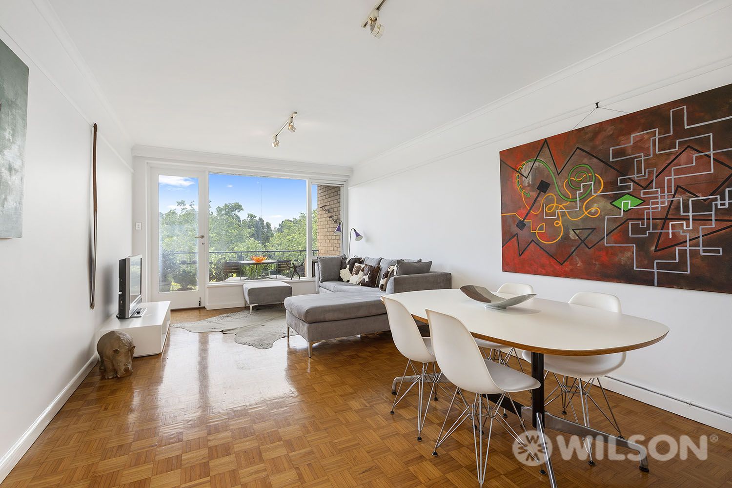 - Bright living/dining room and balcony enjoy leafy backdrop