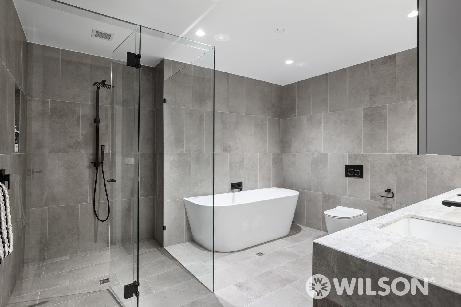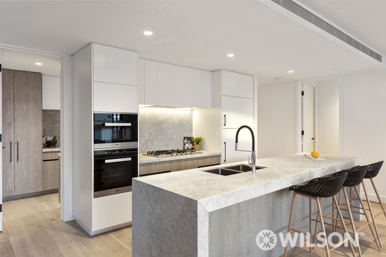 Complementing the contemporary organic colour palette, the state-of-the-art kitchen is sheathed in natural stone and compressively equipped to satisfy the needs of cooking aficionadas with a full suite of high-end Miele appliances, integrated fridge and freezer, central island bench/breakfast bar and butler’s pantry fitted with extensive storage.