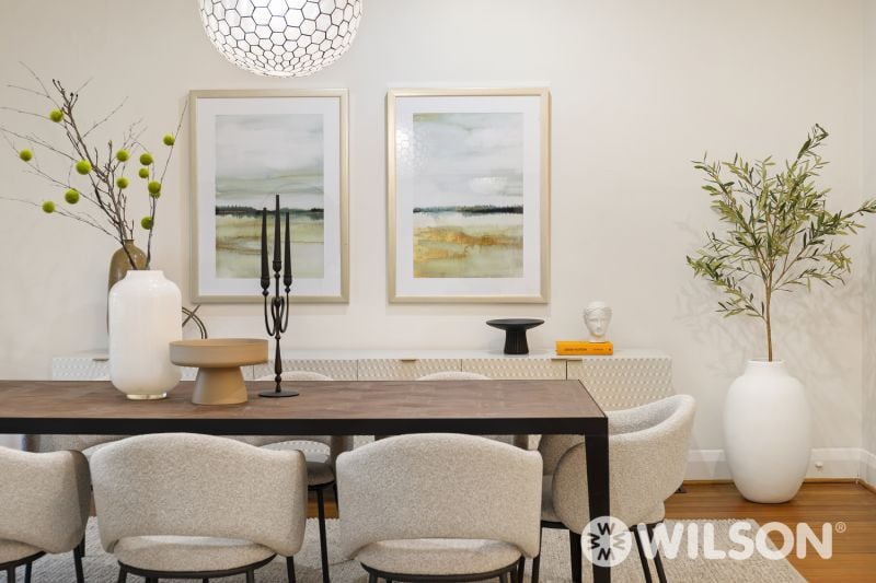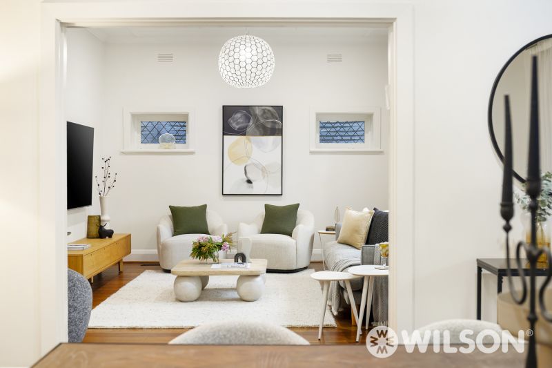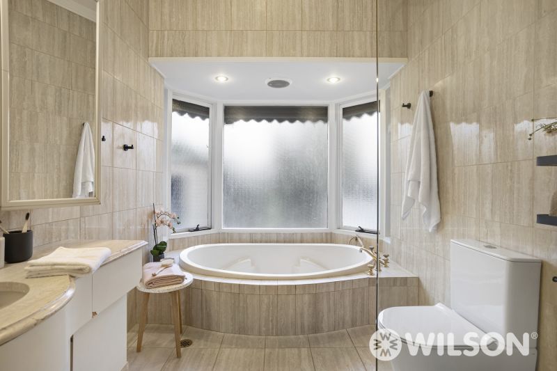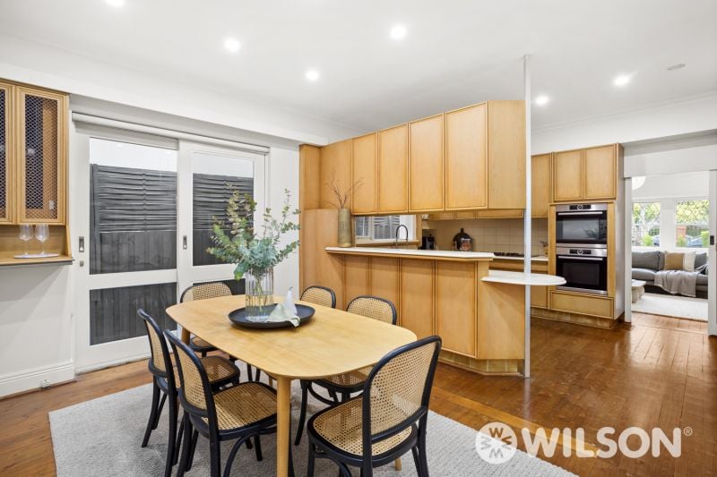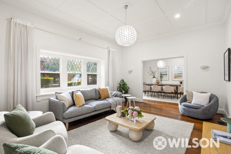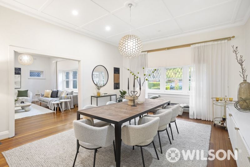 Showcasing polished floorboards throughout, the home welcomes you with a wide entry foyer that leads to a bay-windowed formal dining room and an adjoining living area – ideal for both relaxation and entertaining. The retro-appointed layout continues with a spacious kitchen and casual meals zone, spa bathroom, and generous bedrooms, all serviced by central heating and air conditioning for year-round comfort.